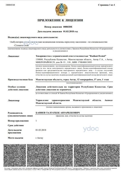 Стоматология «Radiant» (Радиант), Актау: врачи, отзывы о клинике и ее врачах, телефон, официальный сайт, адрес - Актау, мкр. 12, д. 37.
