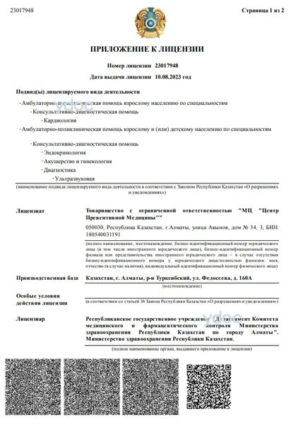 «Центр Превентивной медицины» на проспекте Достык в Алматы осуществляет многопрофильную медицинскую деятельность с акцентом на комплексную диагностику и профилактику заболеваний. Основными направлениями работы являются гинекология, репродуктология, терапия, эндокринология, кардиология, урология, гастроэнтерология, неврология, а также педиатрия. В клинике применяются современные протоколы обследования, включая ультразвуковую диагностику различных органов и систем для пациентов от двух лет, лабораторные исследования всех видов, электрокардиографию, ультразвуковую доплерографию сосудов. Доступны услуги дневного стационара и процедурного кабинета для выполнения всех видов инъекций. Открыт центр с понедельника по пятницу с 8:00 до 18:00, в субботу — с 9:00 до 14:00.