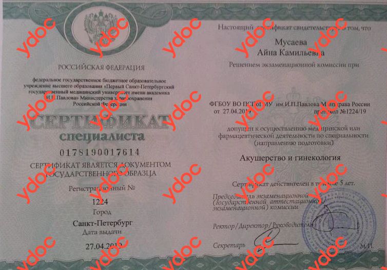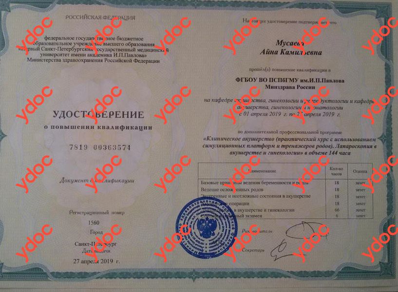 «Акушерство и гинекология с курсом лапароскопии», ФГБОУ ВО ПСПб ГМУ им. И.П. Павлова МЗ РФ, г. Санкт-Петербург