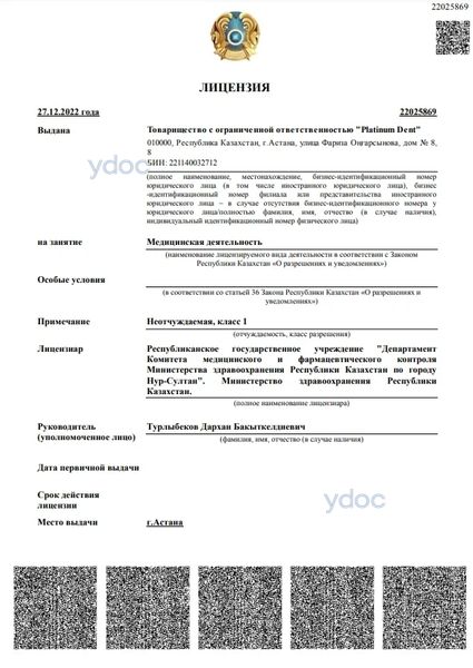 Стоматология «Platinum Dent» (Платинум Дент), Астана: 3 врача, 1 отзыв о клинике и ее врачах, телефон, официальный сайт, адрес - Астана, ул. Фаризы Онгарсыновой, д. 8.