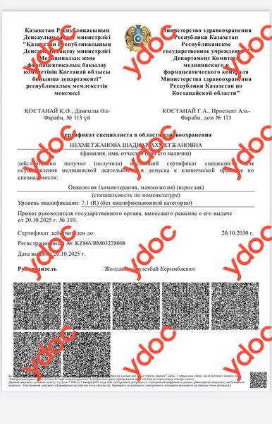 Нехметжанова Шадиар Ахметжановна, Астана: онколог, химиотерапевт, 4 отзыва пациентов, места работы, стаж 9 лет, запись на приём ☎ +7 705 957-99-44.