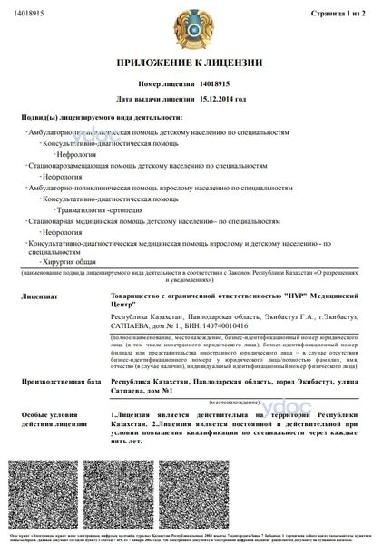 Медицинский центр «Нур» — это современное учреждение, предлагающее широкий спектр диагностических, лечебных и реабилитационных услуг для взрослых и детей. Клиника оснащена высокоточным оборудованием, включая рентген-аппаратуру с минимальной дозой облучения, обеспечивающую качественные снимки и высокую эргономику исследований. В центре работают квалифицированные специалисты: педиатры, терапевты, врачи общей практики, хирурги-травматологи, ЛОРы, невропатологи (взрослые и детские), пульмонологи, эндокринологи, гинекологи, психологи и кардиологи. Медицинский центр предоставляет как амбулаторное, так и стационарное обслуживание. Круглосуточный стационар платного формата оборудован комфортабельными одно- и двухместными палатами с отдельными санузлами. Для пациентов, нуждающихся в восстановительном лечении, доступны бесплатные программы реабилитации после инсульта, травм, кардио- и нейрохирургических операций, а также при хронических заболеваниях. Центр работает с понедельника по пятницу с 8:00 до 17:00, в субботу — с 9:00 до 12:00.