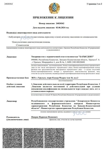 Стоматология «Batys Dent» в микрорайоне Кадыра Мырза Али, Орал: дәрігерлер, пікірлер клиника және оның дәрігерлері туралы, телефон, ресми сайт, мекен-жайы - Орал, мкр. имени Кадыра Мырза Али, д. 16.