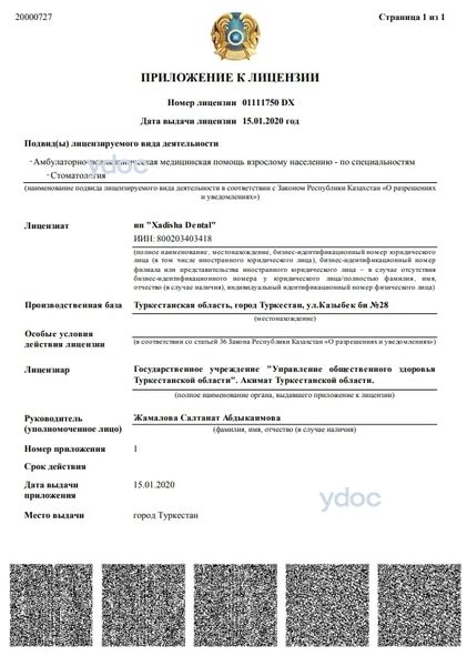 Стоматология «Xadisha dental» (Хадиша дентал), Туркестан: 1 врач, отзывы о клинике и ее врачах, телефон, официальный сайт, адрес - Туркестан, ул. Казыбек Би, д. 28.